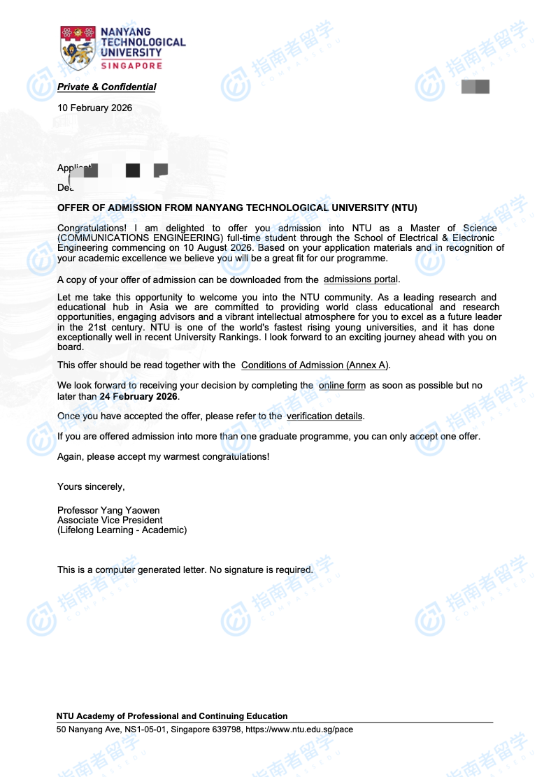 南洋理工大學(xué)通信工程理學(xué)碩士研究生offer一枚