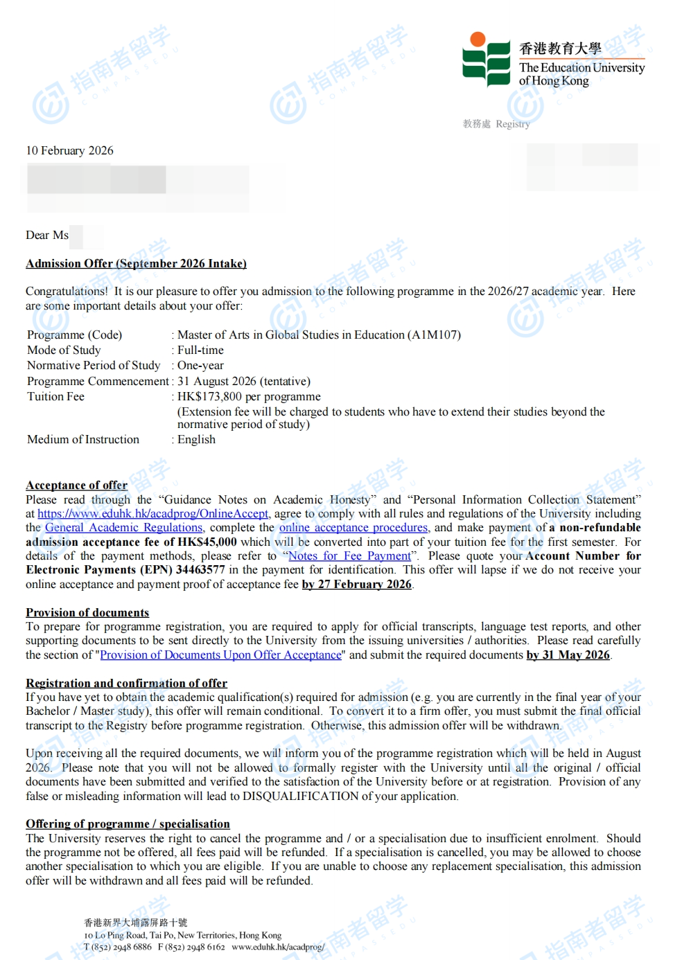 香港教育大學(xué)全球教育研究文學(xué)碩士研究生offer一枚