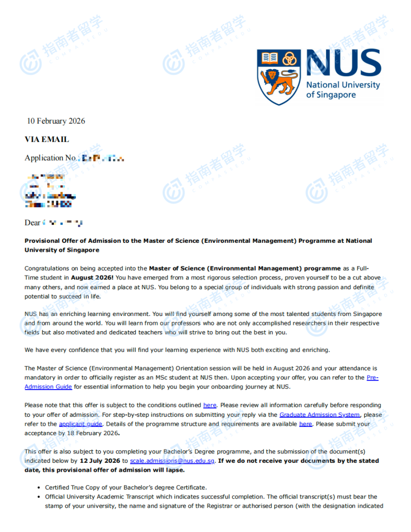 新加坡國立大學(xué)環(huán)境管理理學(xué)碩士研究生offer一枚