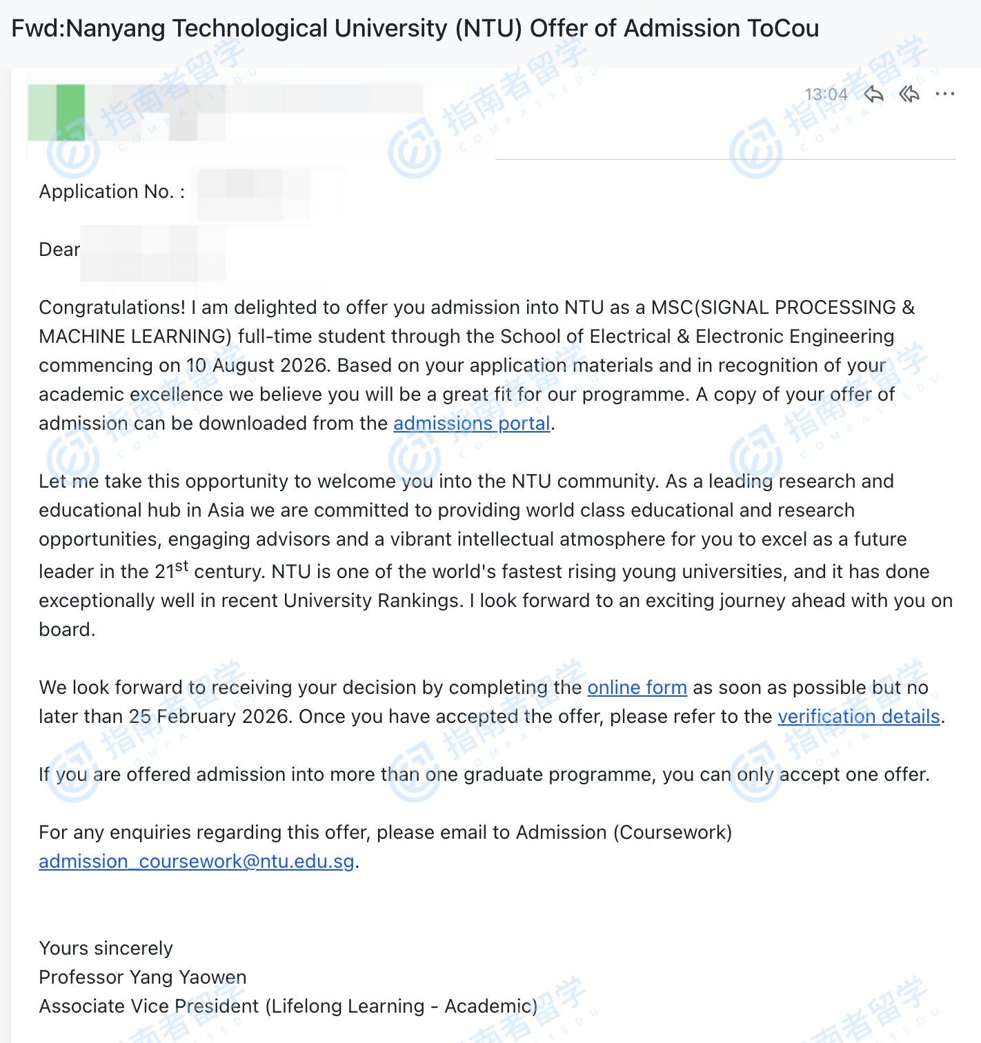南洋理工大學(xué)信號處理和機器學(xué)習(xí)理學(xué)碩士研究生offer一枚