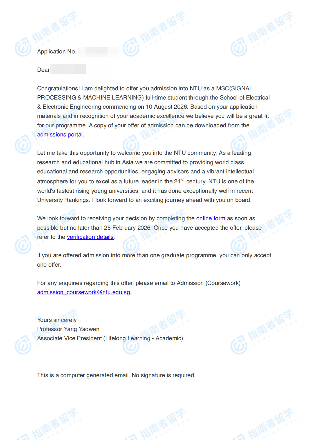 南洋理工大學(xué)信號處理和機(jī)器學(xué)習(xí)理學(xué)碩士研究生offer一枚