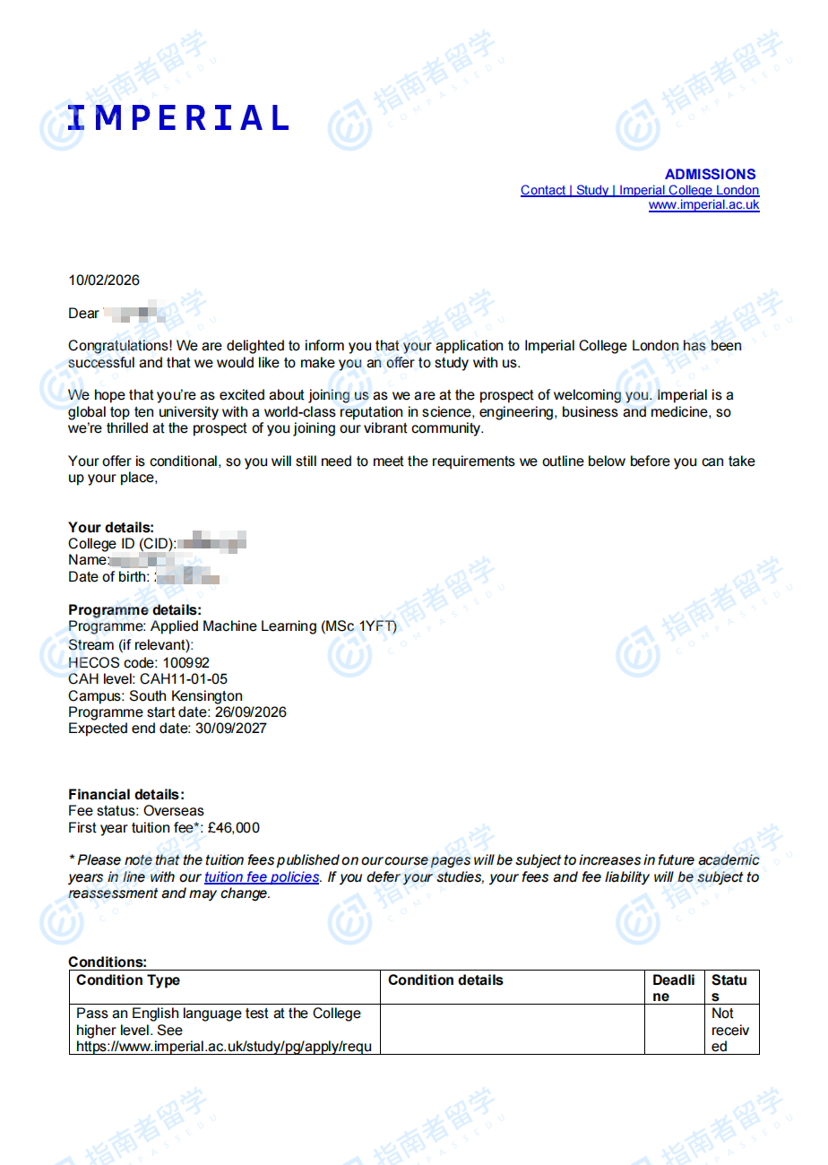 帝國理工學(xué)院應(yīng)用機(jī)器學(xué)習(xí)理學(xué)碩士研究生offer一枚