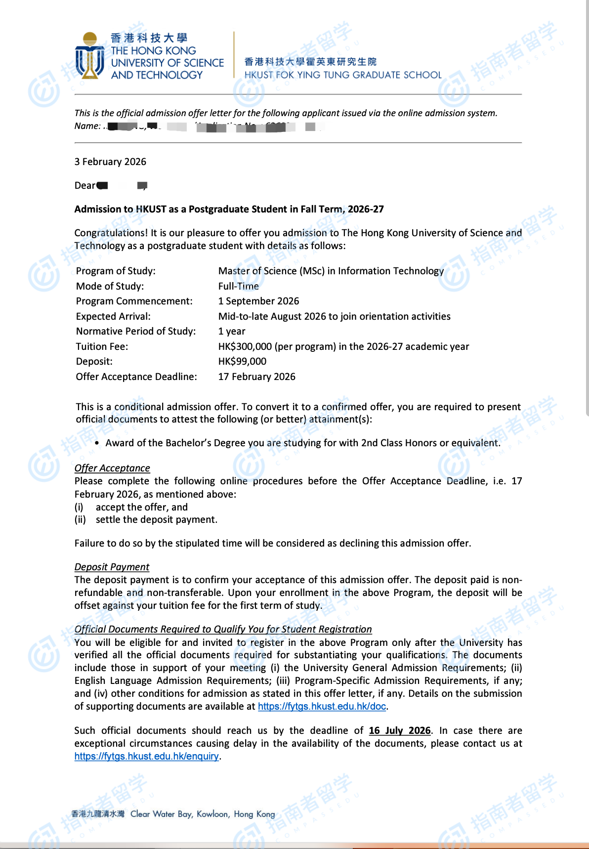 香港科技大學(xué)信息技術(shù)理學(xué)碩士研究生offer一枚