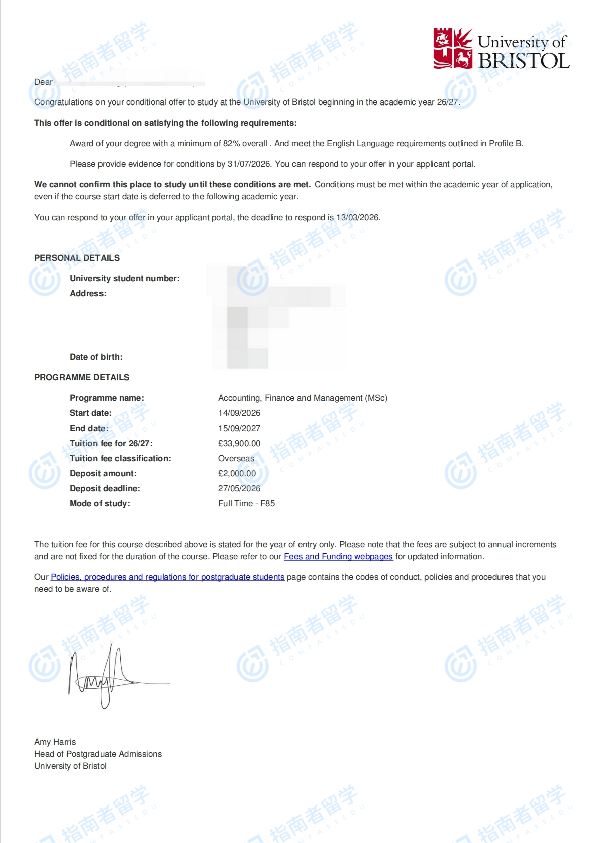 布里斯托大學會計、金融與管理理學碩士研究生offer一枚