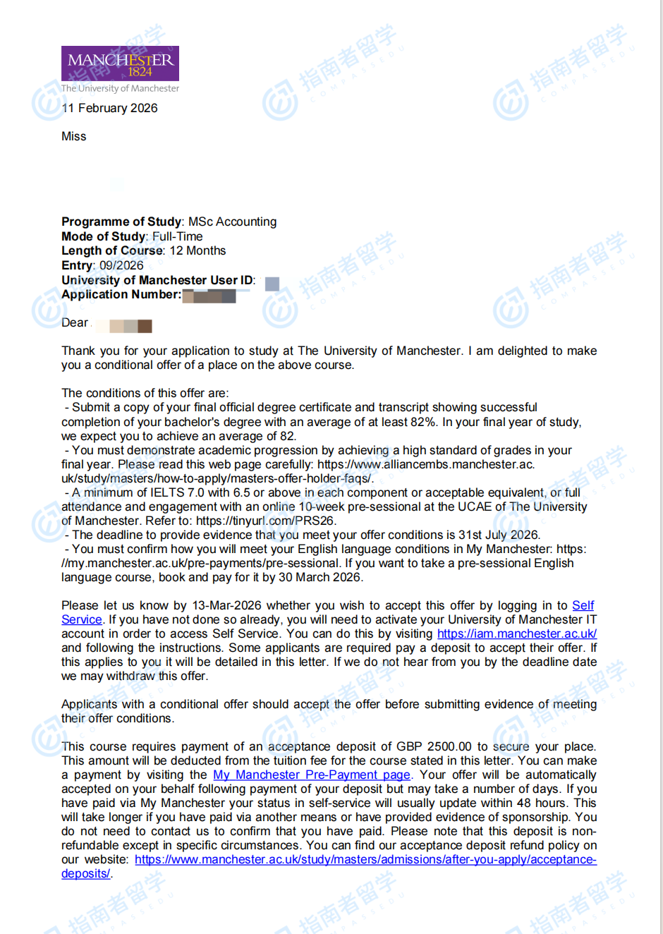 曼徹斯特大學(xué)會(huì)計(jì)學(xué)理學(xué)碩士研究生offer一枚