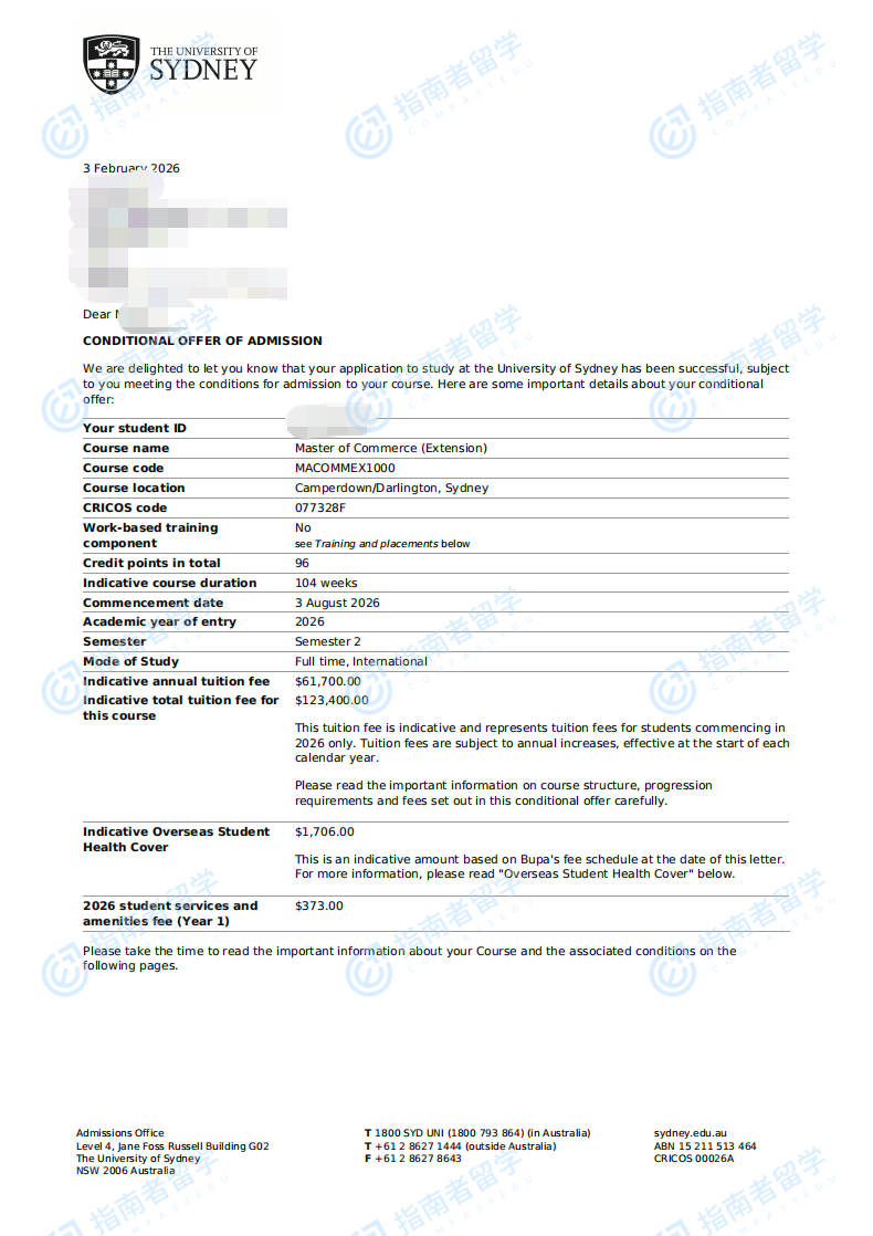 悉尼大學(xué)商學(xué)碩士(擴(kuò)展課程)研究生offer一枚