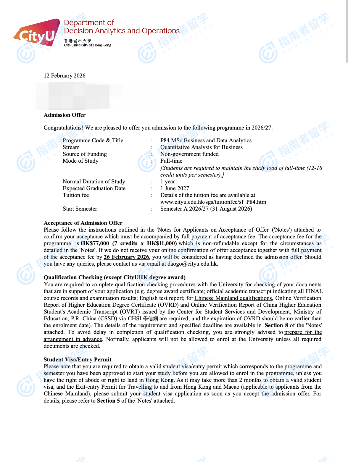 香港城市大學(xué)商業(yè)及數(shù)據(jù)分析理學(xué)碩士研究生offer一枚