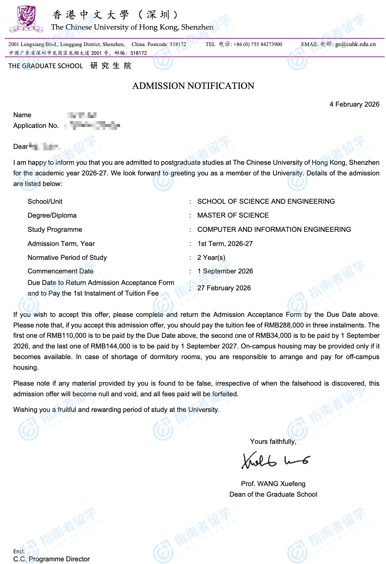 香港中文大學(xué)計算機與信息工程理學(xué)碩士(CUHK-Shenzhen)研究生offer一枚