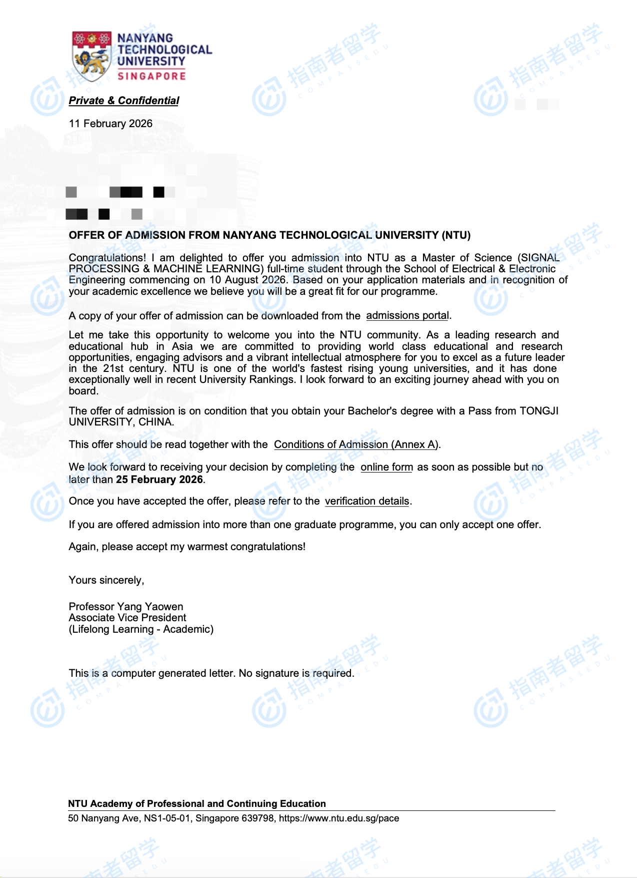 南洋理工大學(xué)信號處理和機(jī)器學(xué)習(xí)理學(xué)碩士研究生offer一枚