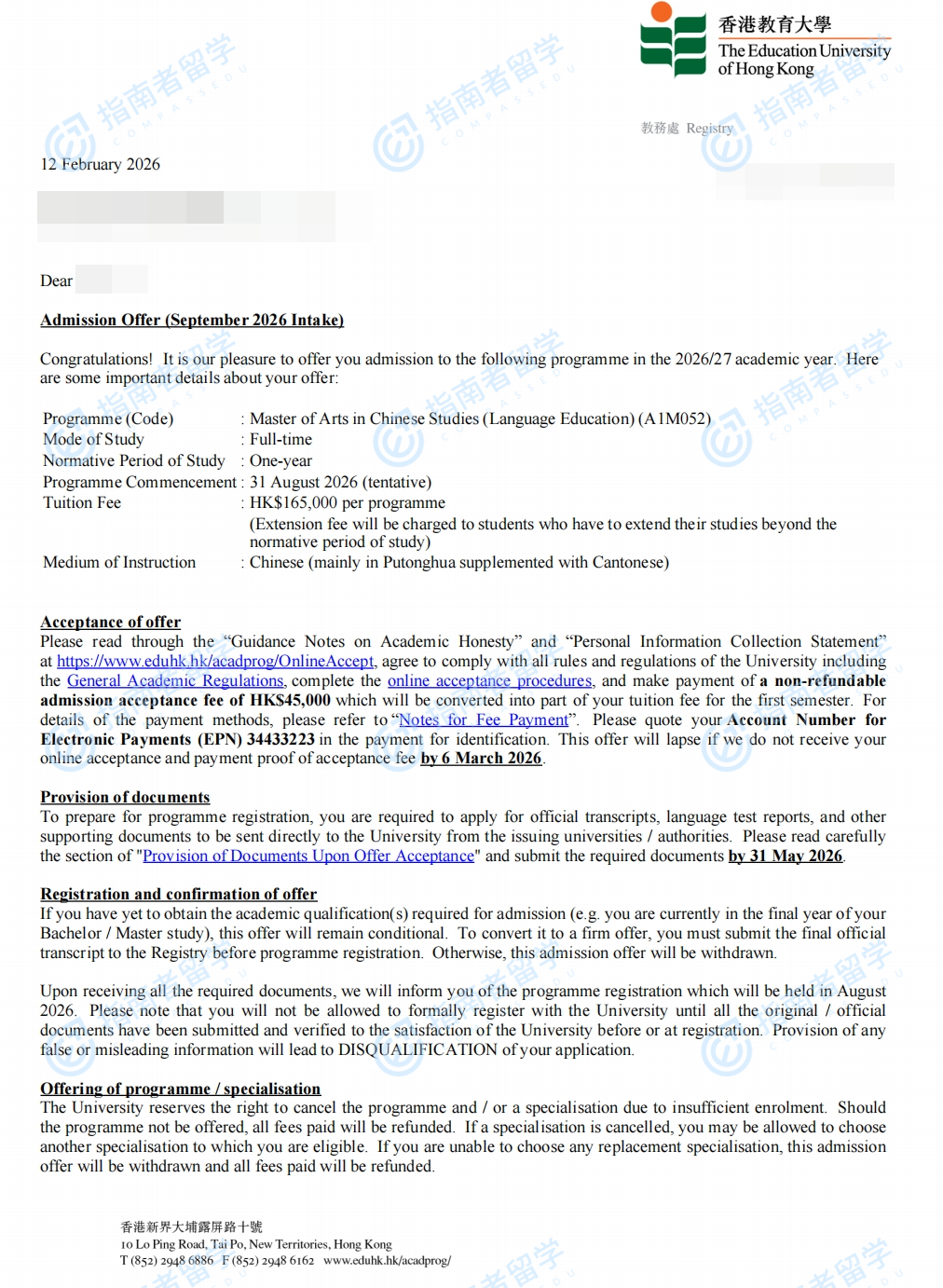 香港教育大學中文研究文學碩士(語文教育)研究生offer一枚