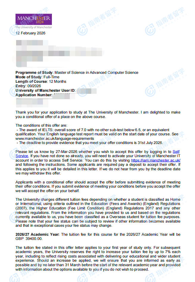 曼徹斯特大學高級計算機科學理學碩士研究生offer一枚