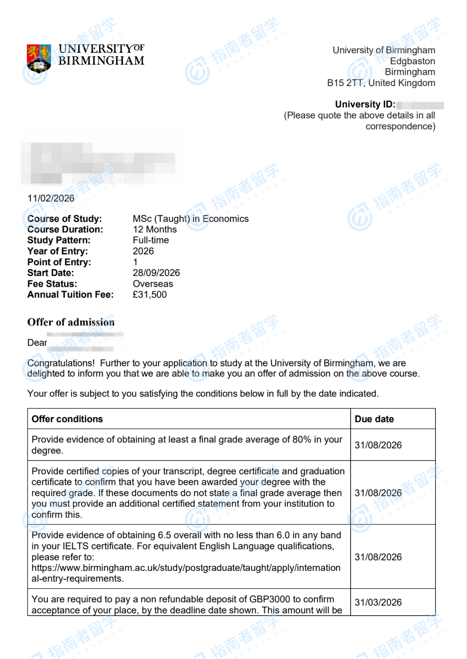 伯明翰大學經(jīng)濟學理學碩士研究生offer一枚