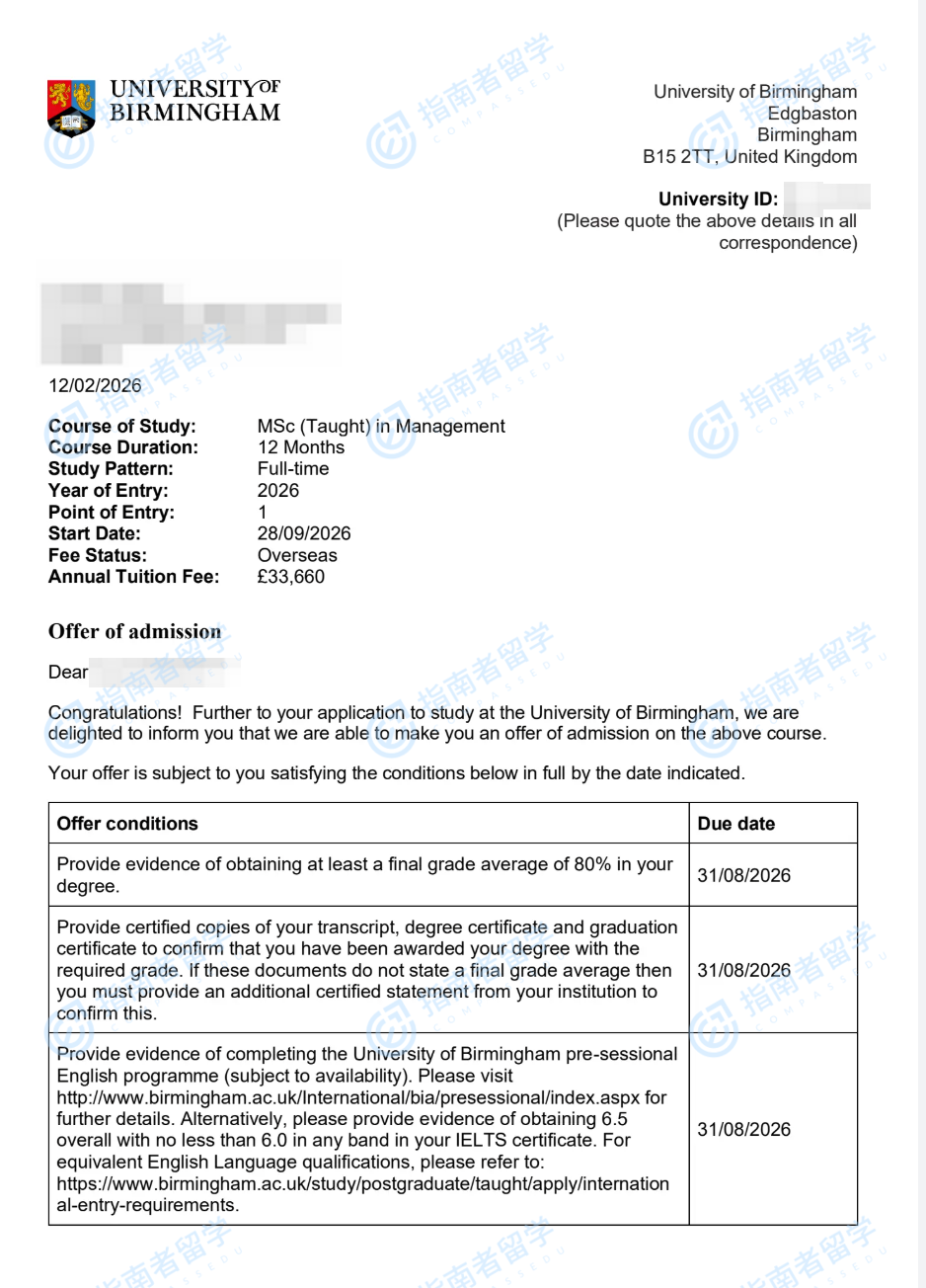 伯明翰大學(xué)管理學(xué)理學(xué)碩士研究生offer一枚