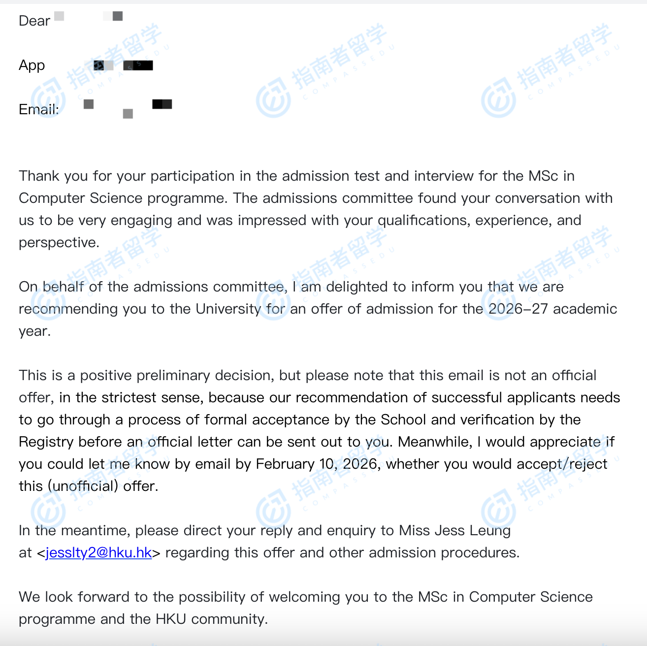 香港大學(xué)計算機(jī)科學(xué)理學(xué)碩士(常規(guī)方向)研究生offer一枚