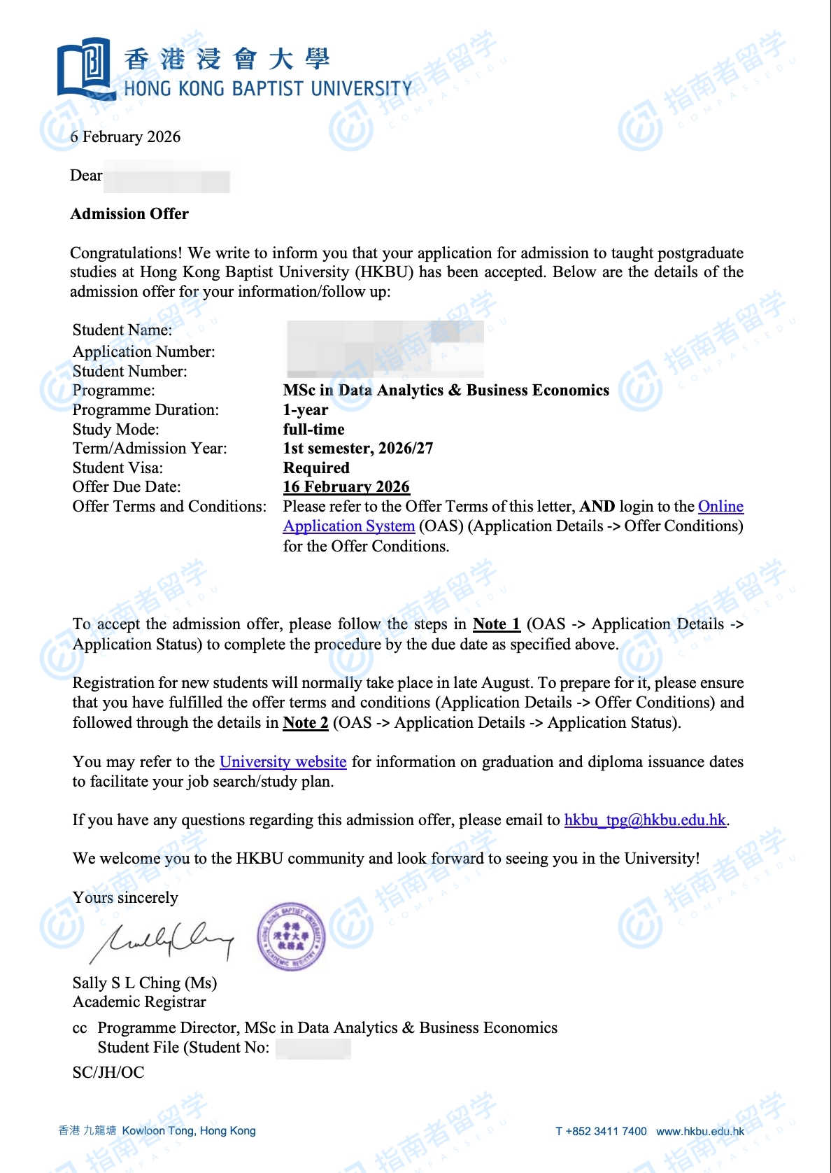 香港浸會大學(xué)數(shù)據(jù)分析與商業(yè)經(jīng)濟(jì)理學(xué)碩士研究生offer一枚
