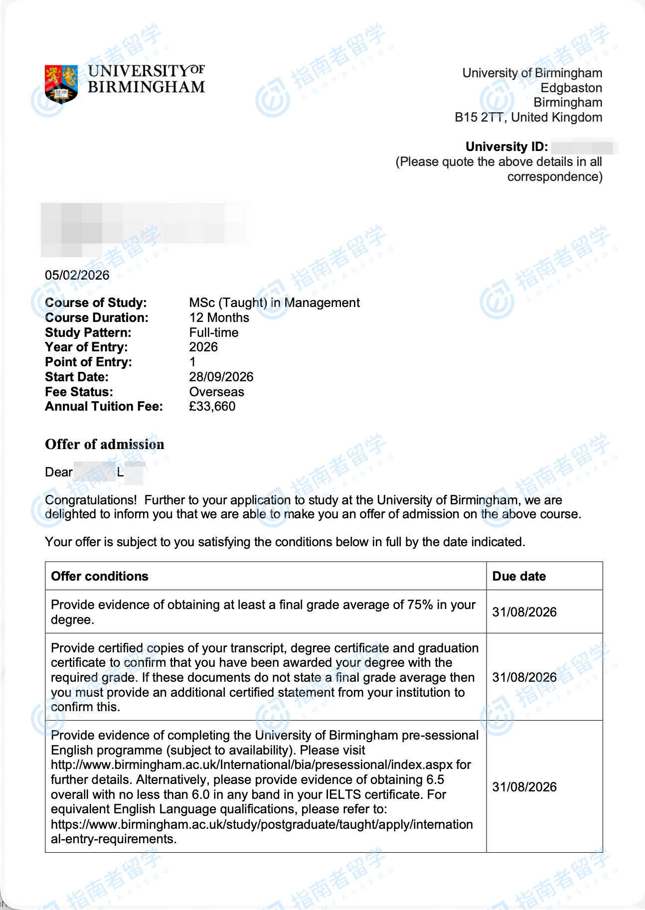伯明翰大學管理學理學碩士研究生offer一枚