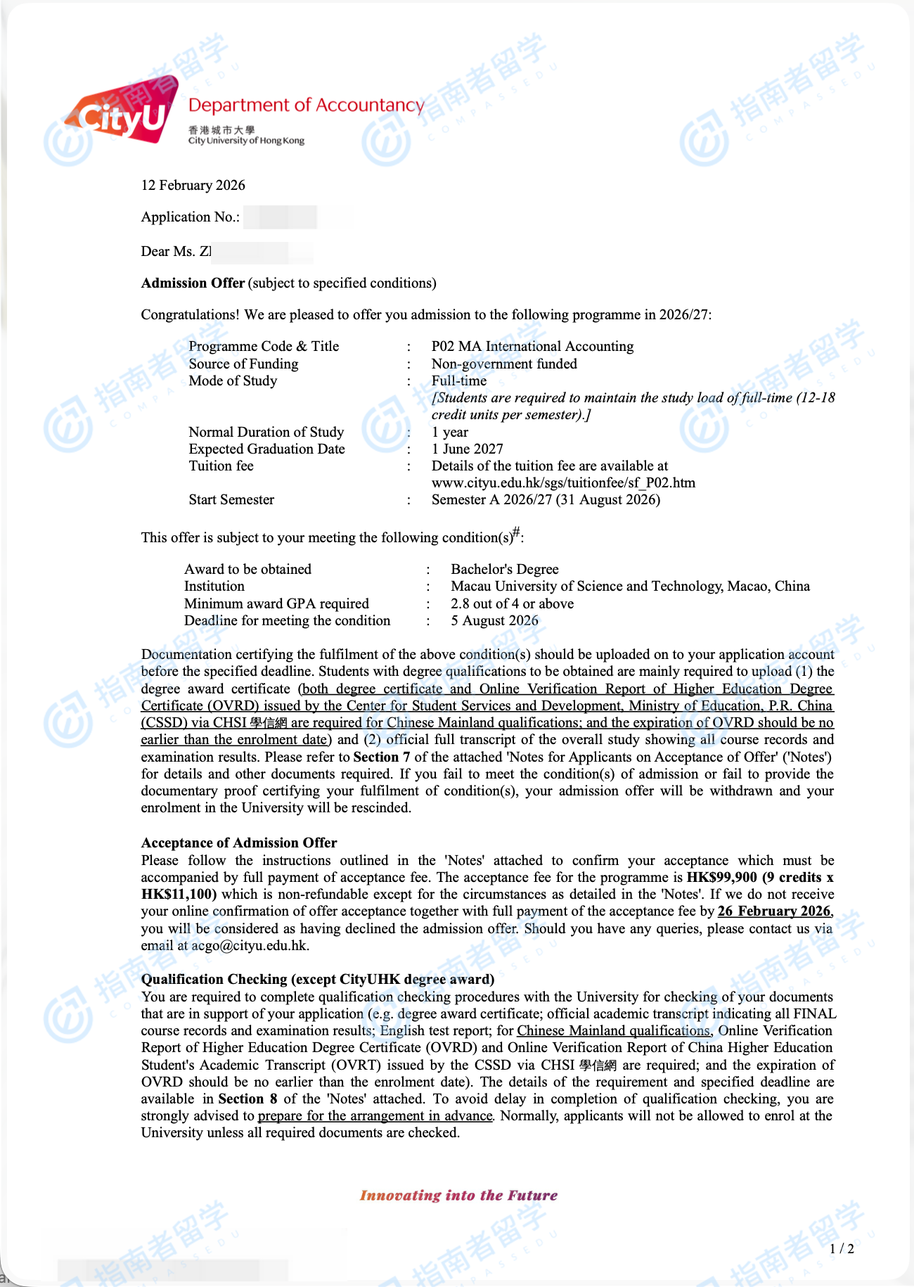 香港城市大學(xué)國(guó)際會(huì)計(jì)學(xué)文學(xué)碩士研究生offer一枚