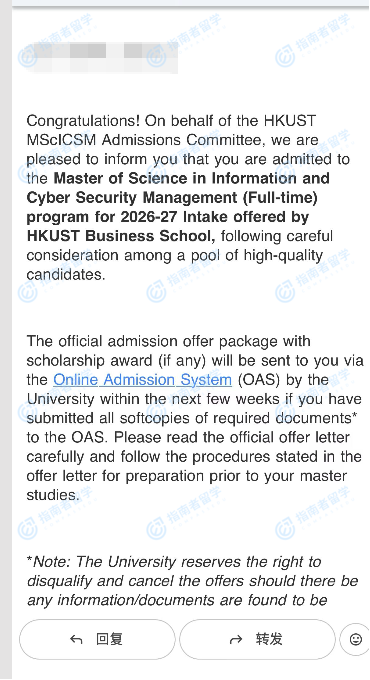 香港科技大學(xué)信息與網(wǎng)絡(luò)安全管理理學(xué)碩士研究生offer一枚