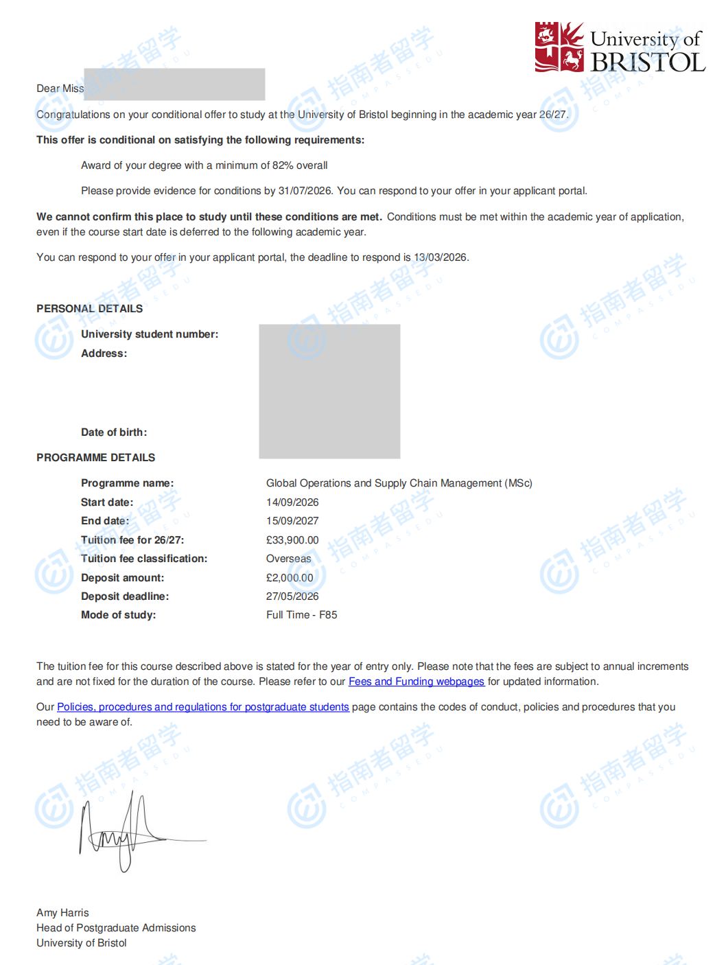 布里斯托大學全球運營與供應鏈管理理學碩士研究生offer一枚