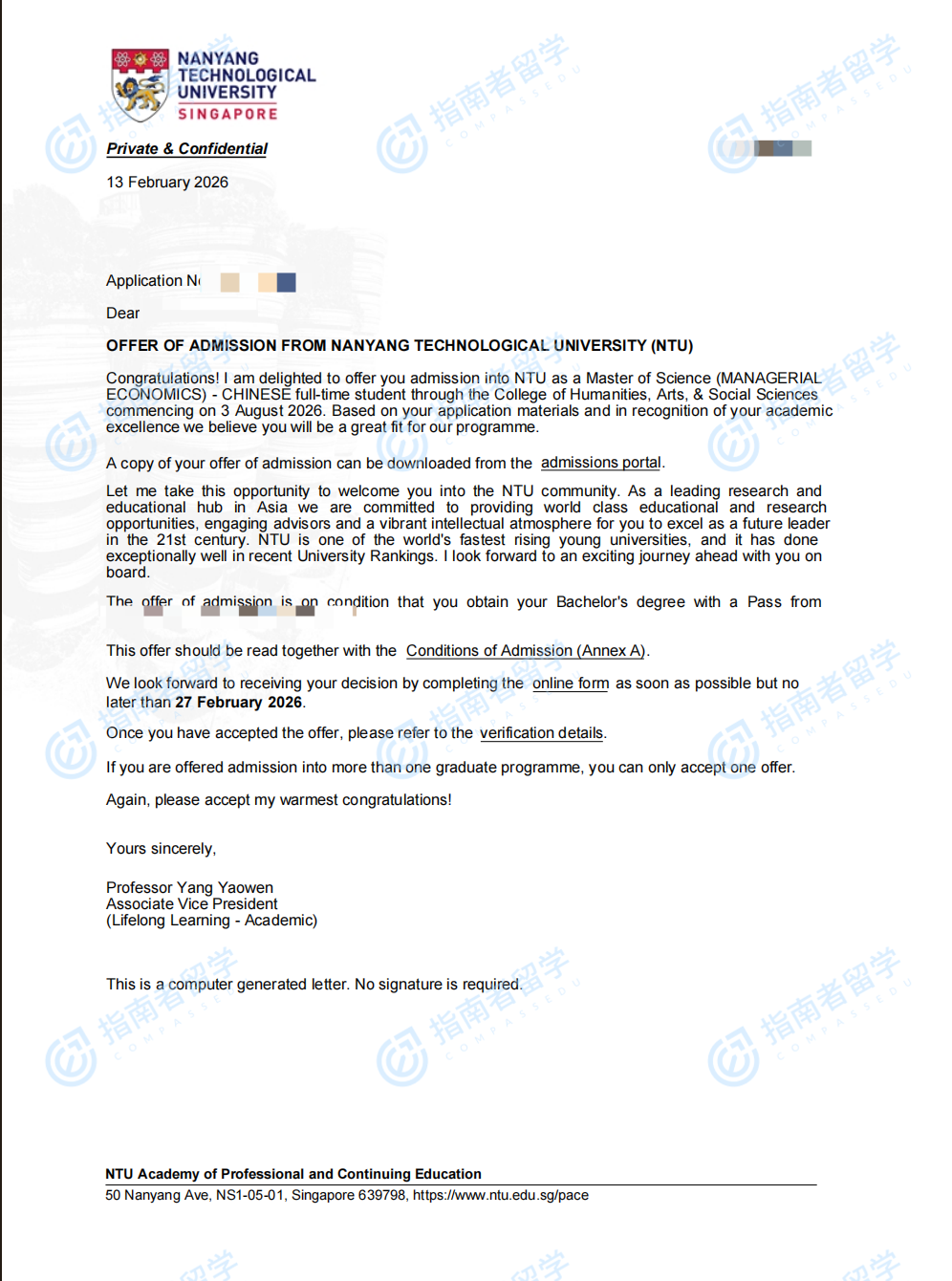 南洋理工大學(xué)管理經(jīng)濟學(xué)理學(xué)碩士(中文授課)研究生offer一枚