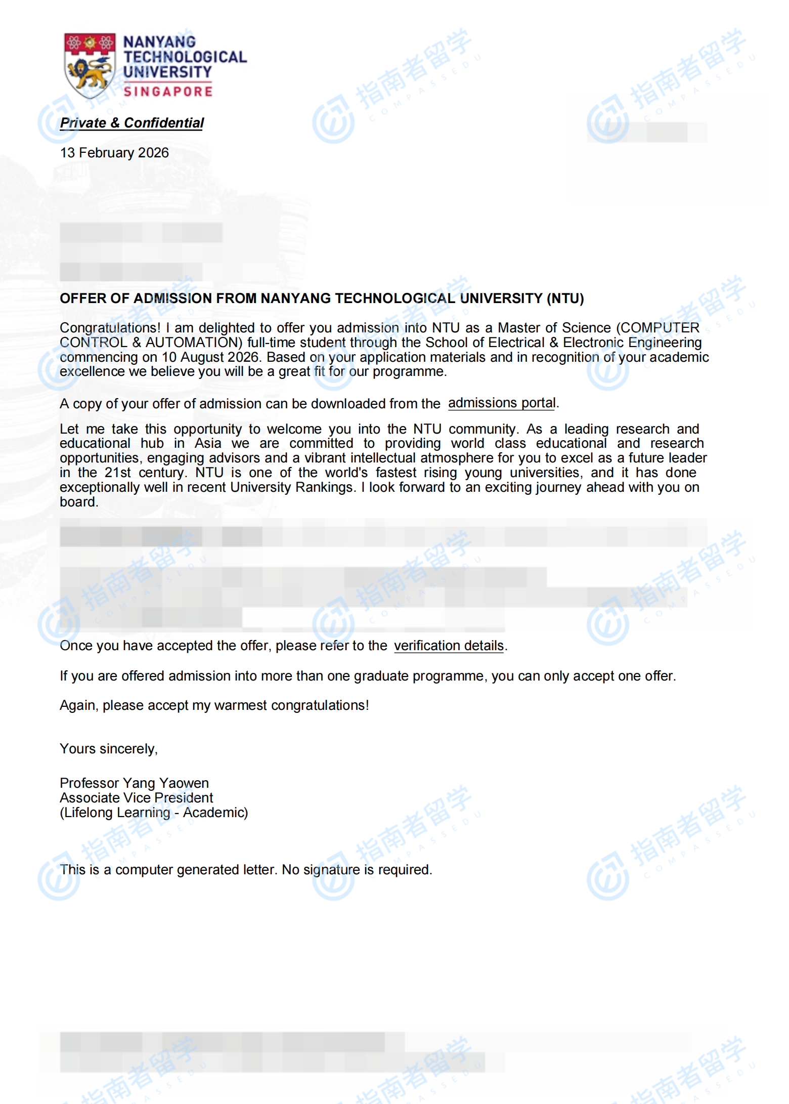 南洋理工大學(xué)計算機控制與自動化理學(xué)碩士研究生offer一枚