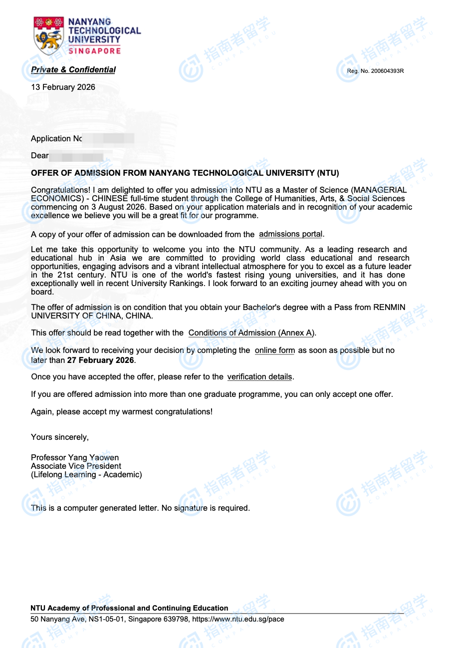 南洋理工大學(xué)管理經(jīng)濟(jì)學(xué)理學(xué)碩士(中文授課)研究生offer一枚