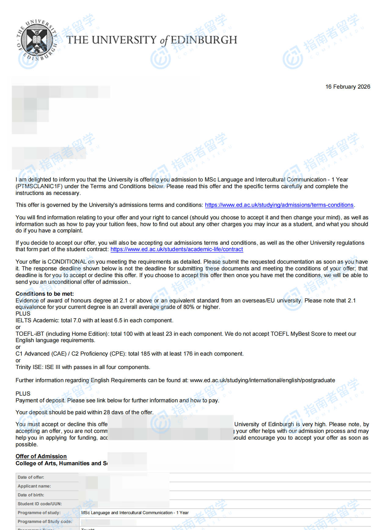 愛丁堡大學語言與跨文化交流理學碩士研究生offer一枚