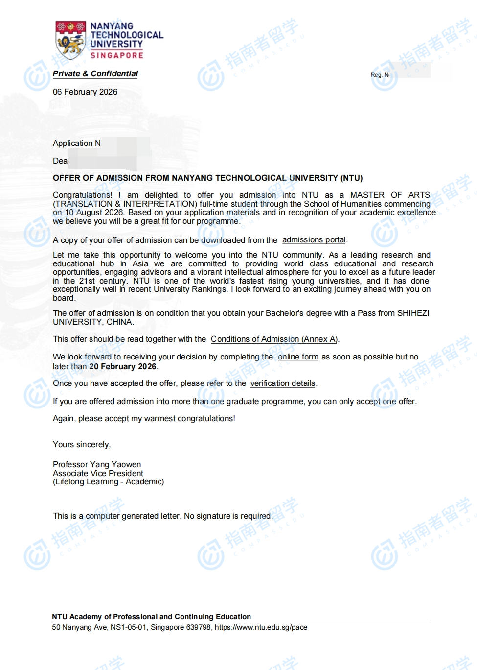 南洋理工大學筆譯與口譯文學碩士研究生offer一枚