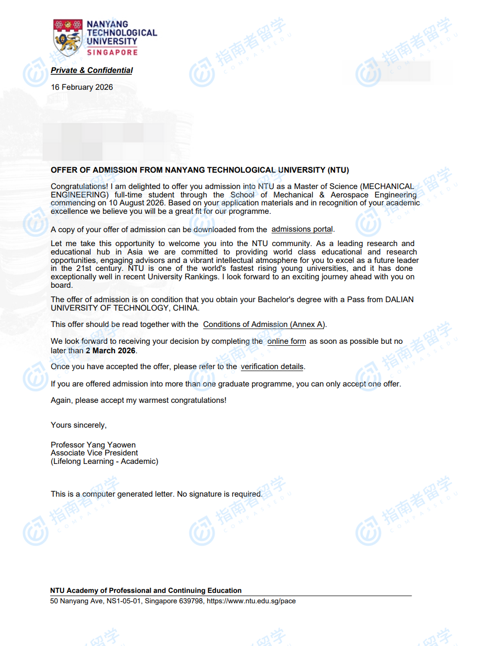 南洋理工大學(xué)機(jī)械工程理學(xué)碩士研究生offer一枚