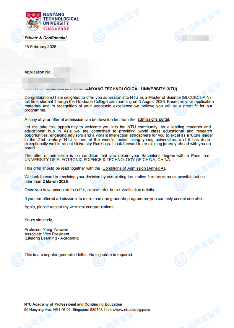 南洋理工大學區(qū)塊鏈理學碩士研究生offer一枚