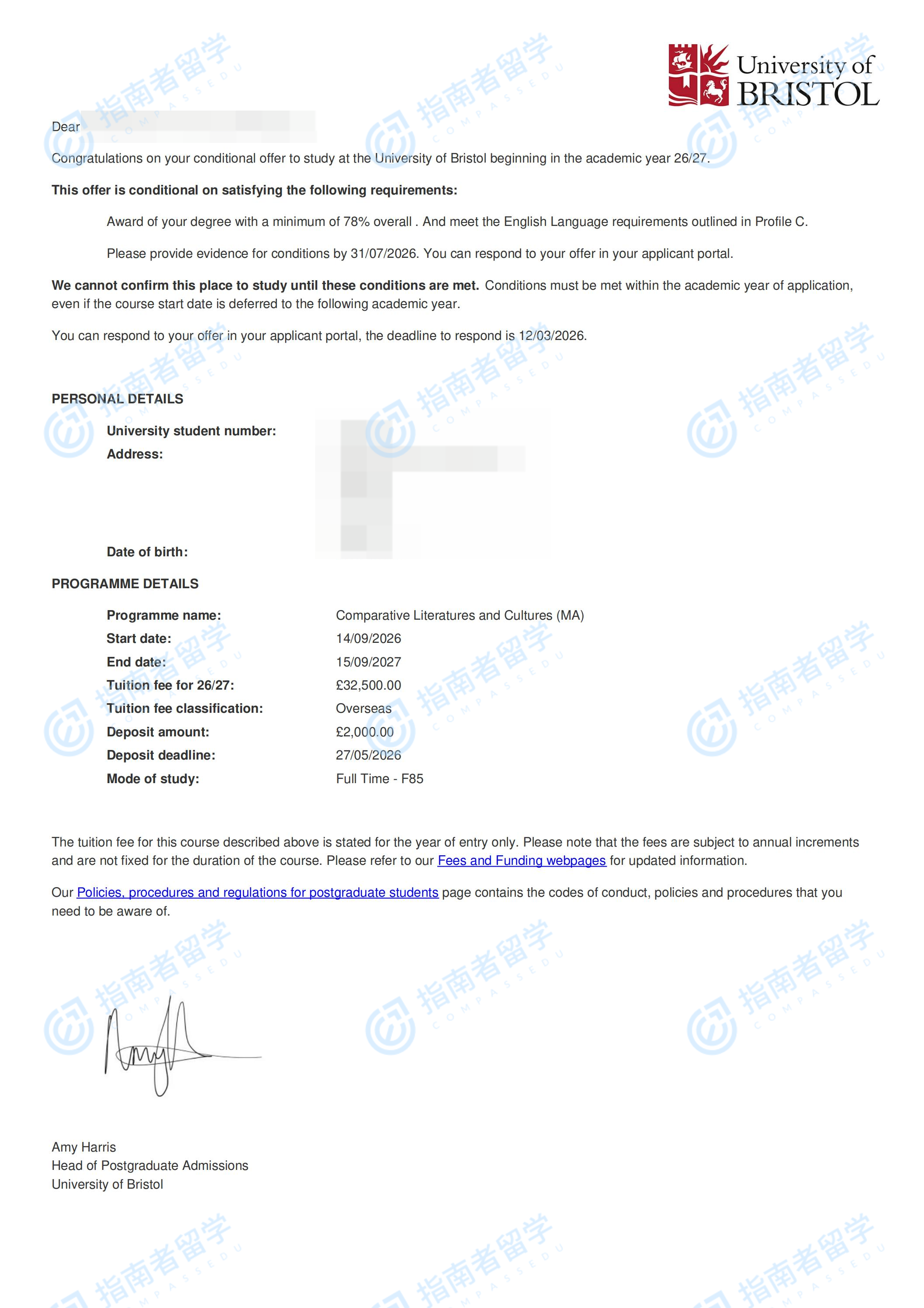 布里斯托大學(xué)比較文學(xué)與文化文學(xué)碩士研究生offer一枚
