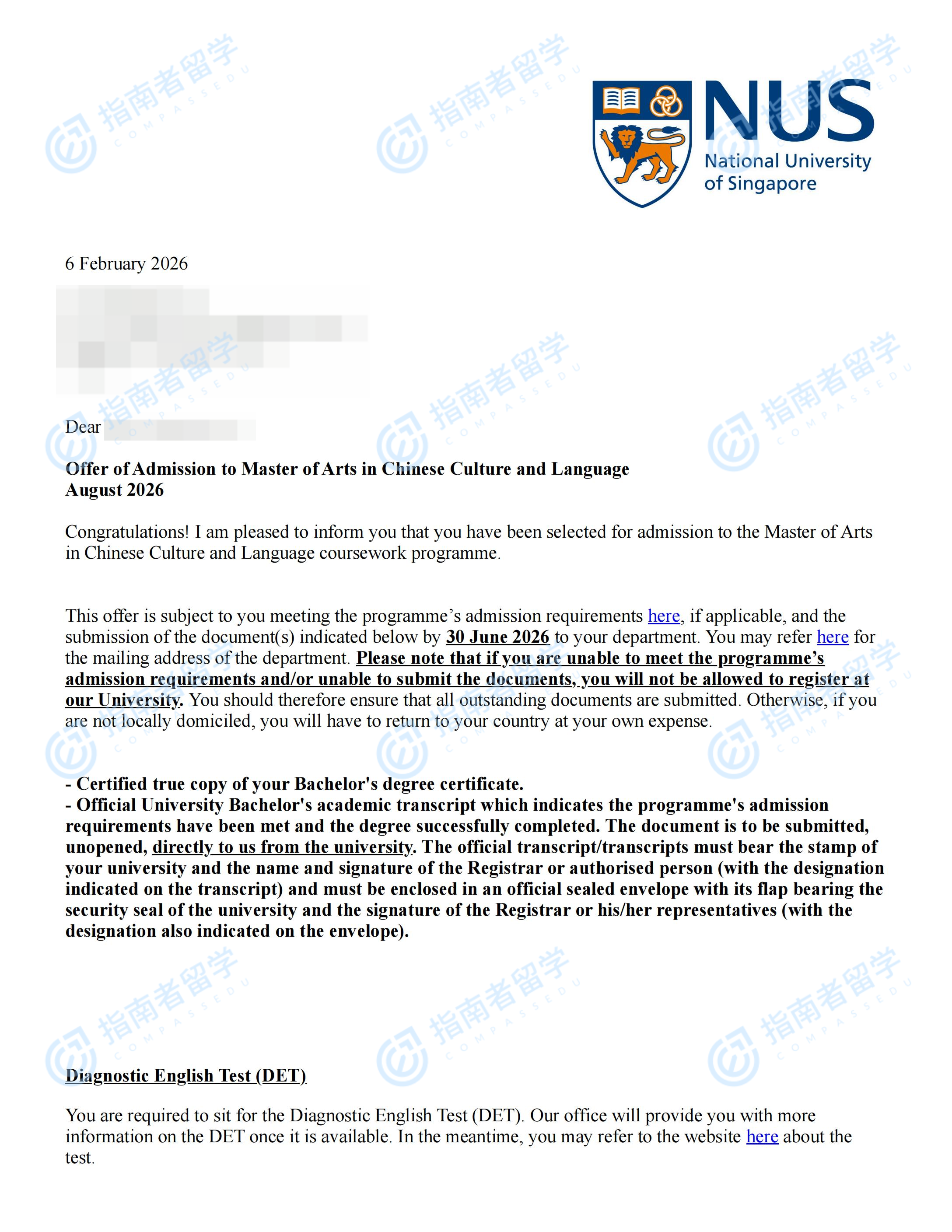 新加坡國(guó)立大學(xué)中國(guó)文化與語(yǔ)言文學(xué)碩士研究生offer一枚