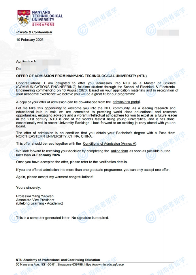 南洋理工大學(xué)通信工程理學(xué)碩士研究生offer一枚