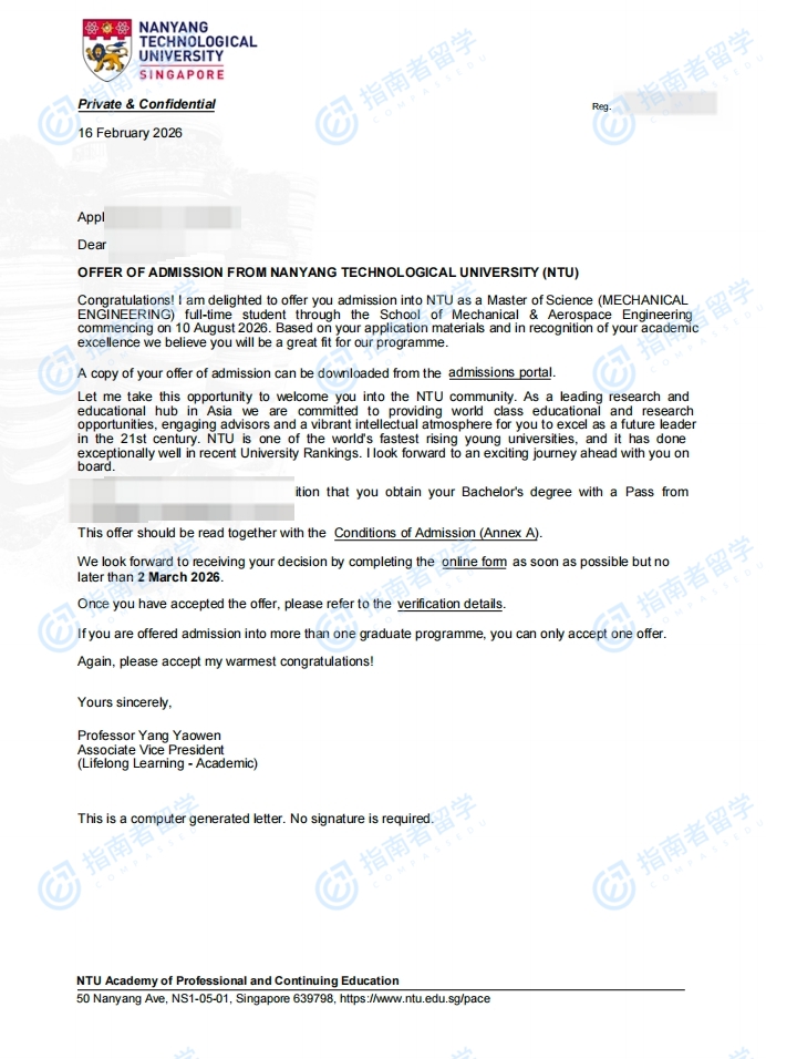 南洋理工大學(xué)機(jī)械工程理學(xué)碩士研究生offer一枚
