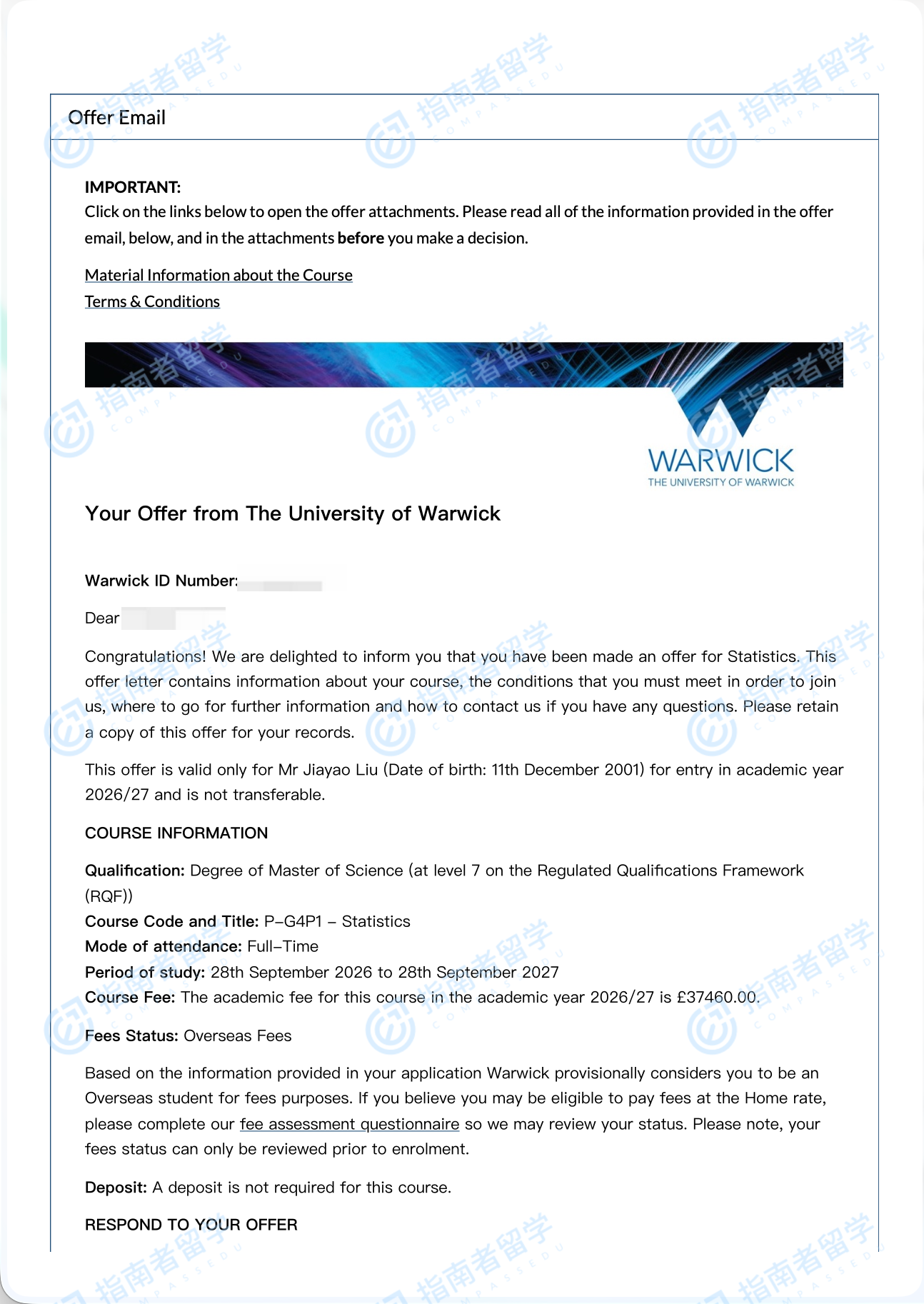 華威大學統(tǒng)計學理學碩士研究生offer一枚