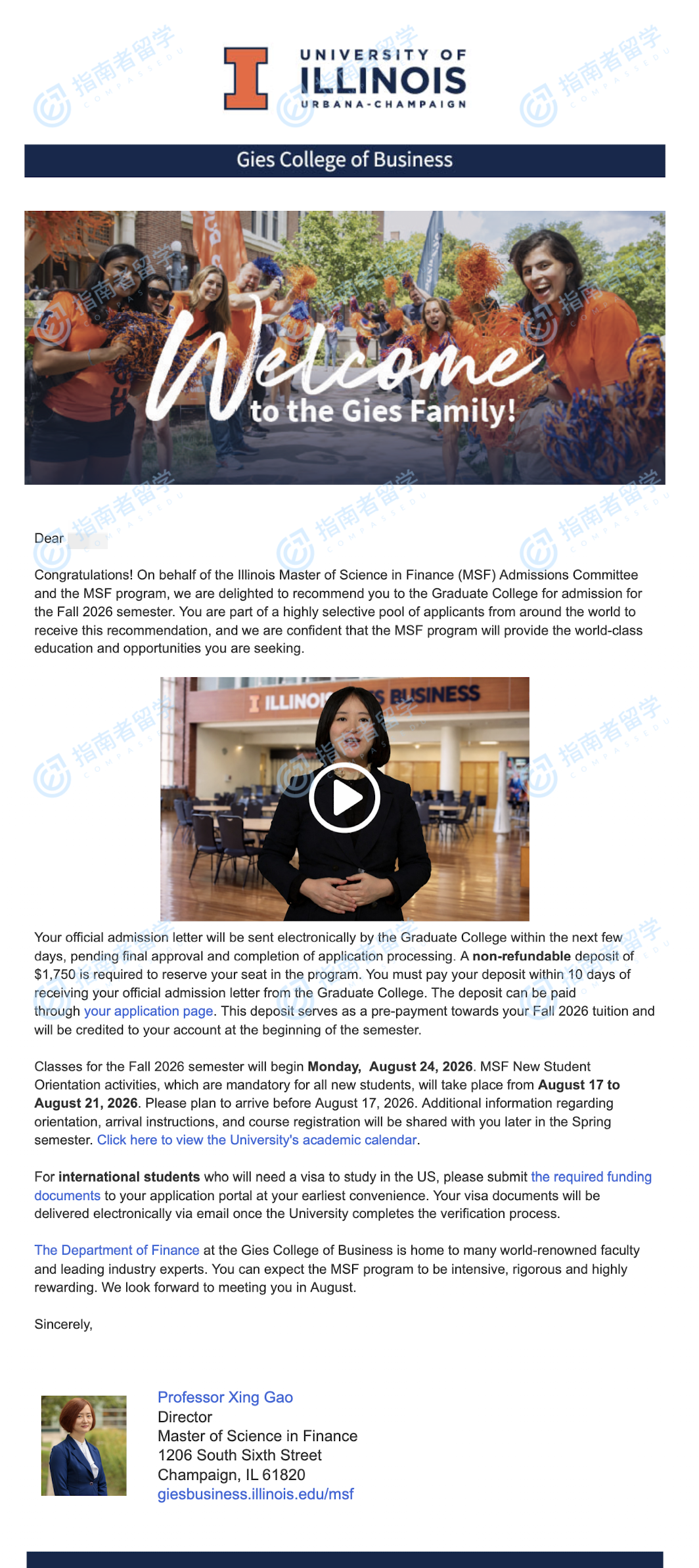 伊利諾伊大學香檳分校金融碩士研究生offer一枚