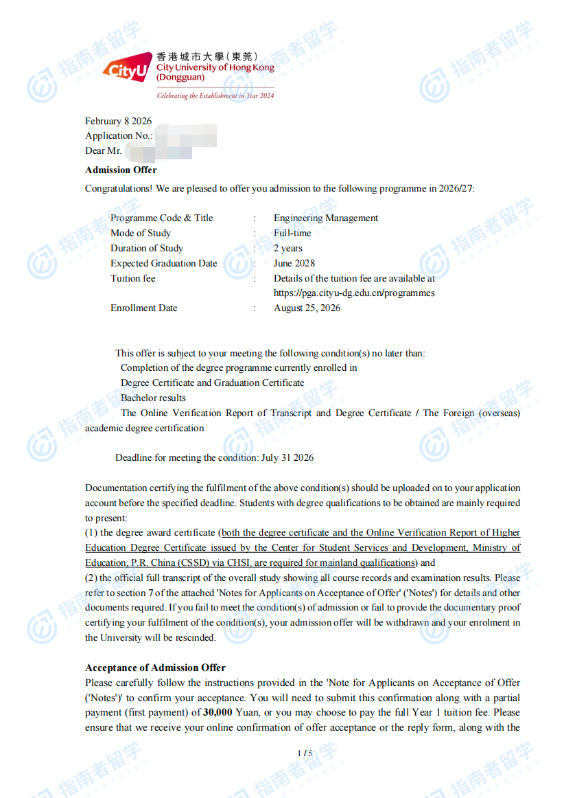 香港城市大學工程管理學理學碩士(CityU-DG)研究生offer一枚