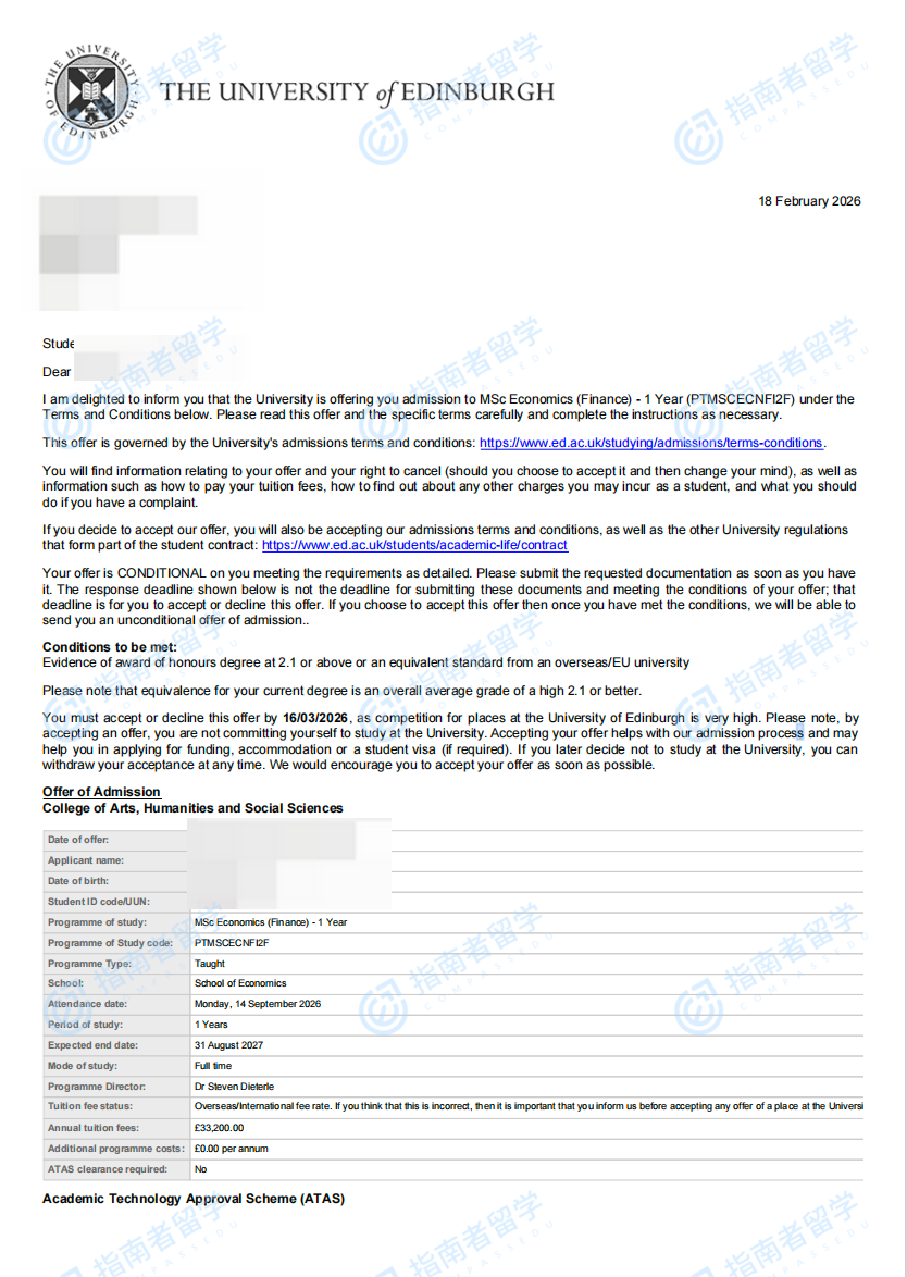 愛丁堡大學(xué)經(jīng)濟(jì)學(xué)(金融)理學(xué)碩士研究生offer一枚