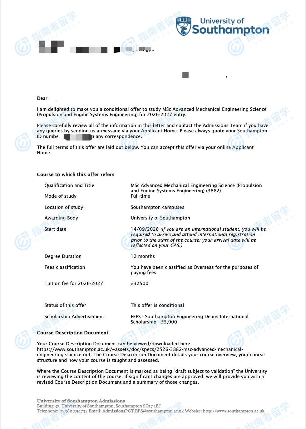 南安普頓大學(xué)推進(jìn)與發(fā)動(dòng)機(jī)系統(tǒng)工程(高級(jí)機(jī)械工程科學(xué))理學(xué)碩士研究生offer一枚