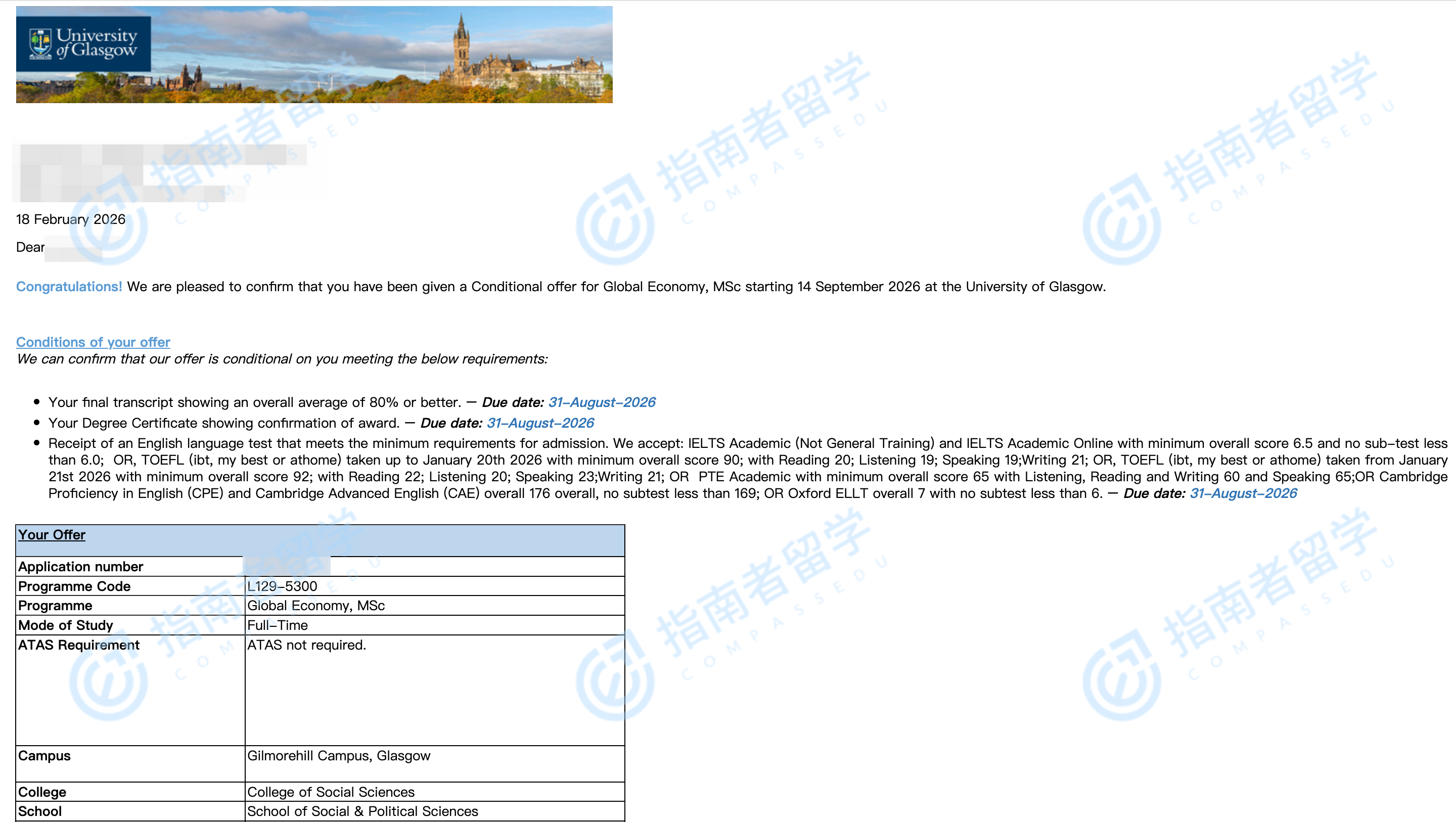 格拉斯哥大學全球經(jīng)濟理學碩士研究生offer一枚