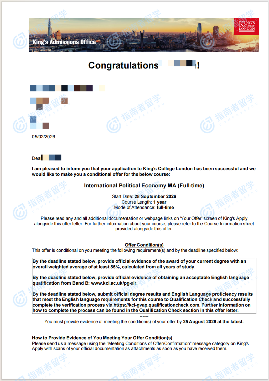 倫敦大學(xué)國王學(xué)院國際政治經(jīng)濟(jì)學(xué)文學(xué)碩士研究生offer一枚