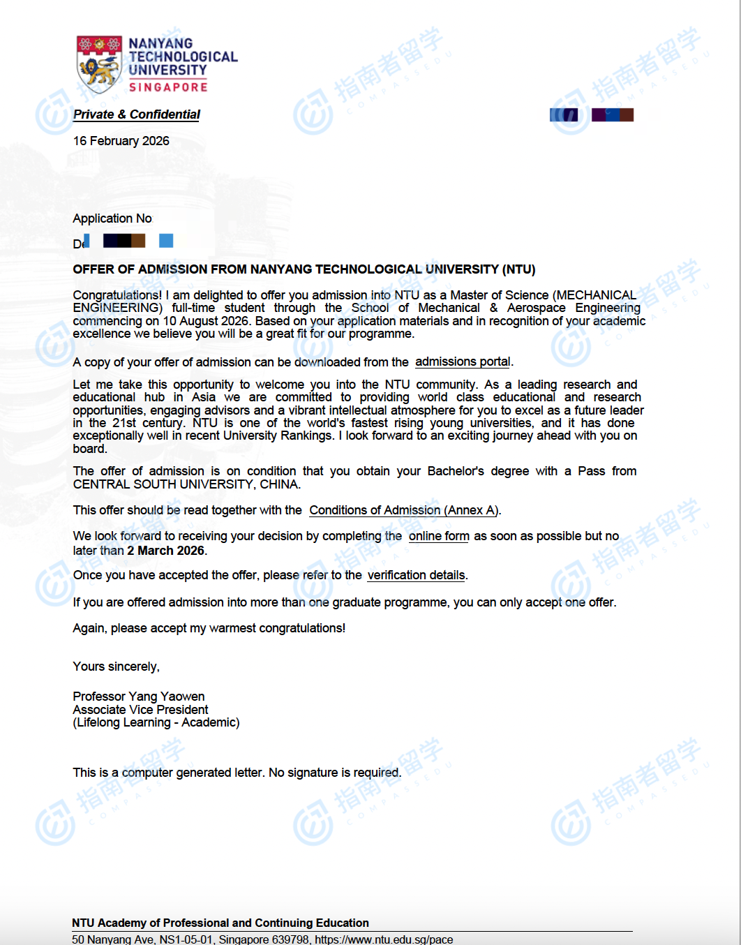 南洋理工大學(xué)機(jī)械工程理學(xué)碩士研究生offer一枚