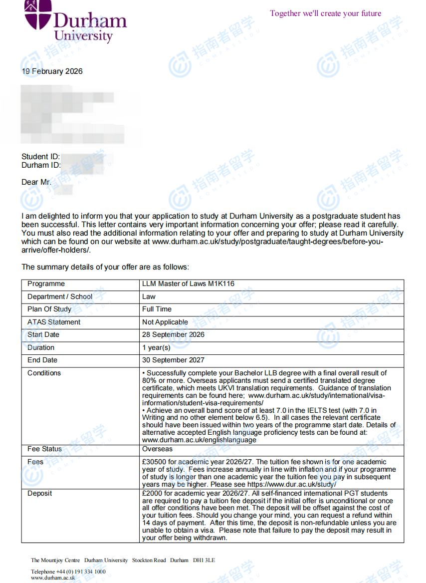 杜倫大學(xué)法學(xué)碩士研究生offer一枚