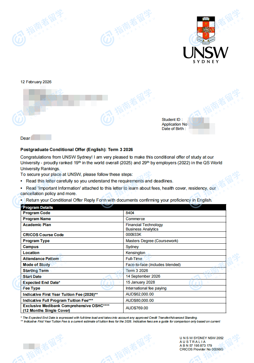 新南威爾士大學(xué)商學(xué)碩士研究生offer一枚