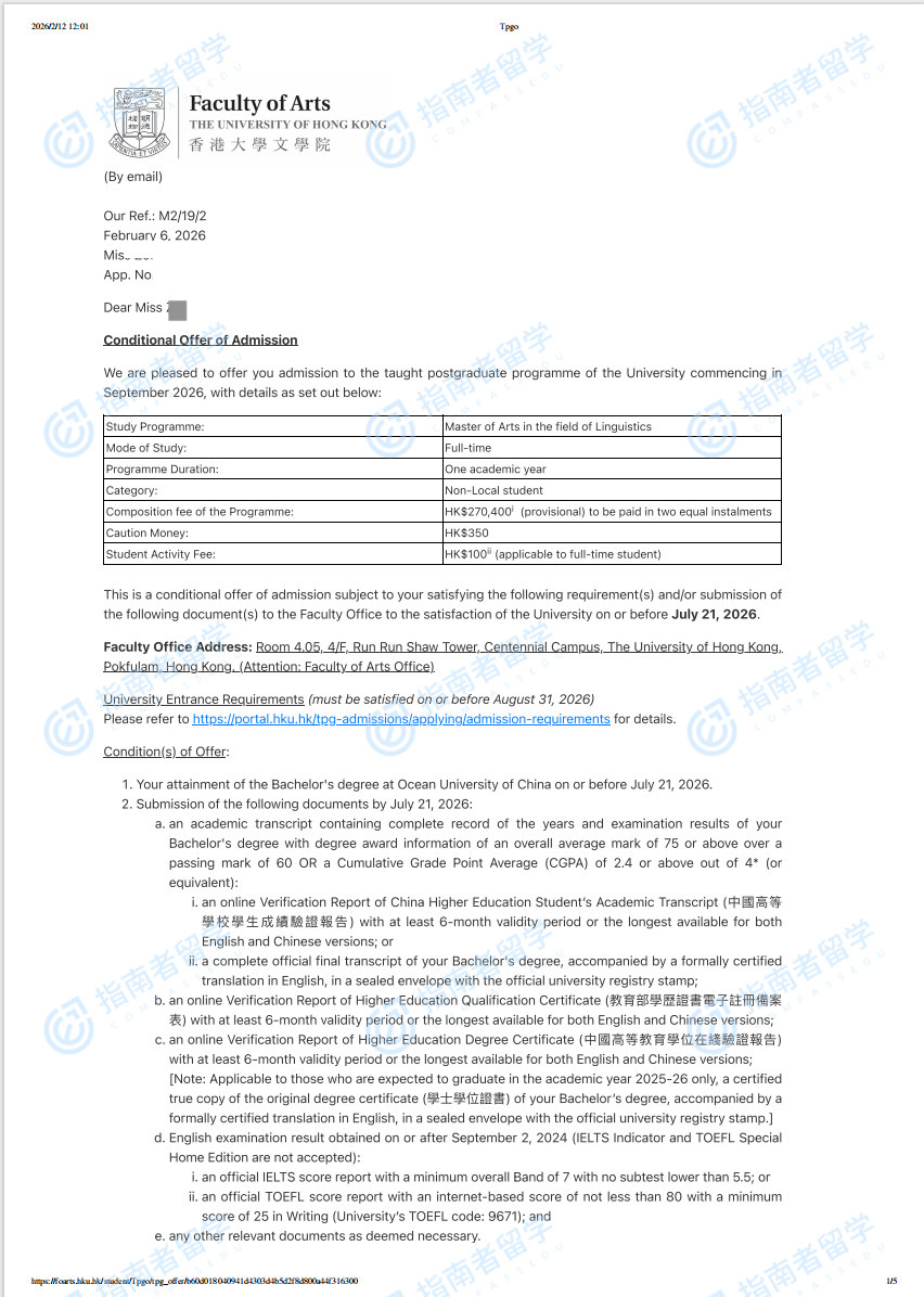 香港大學(xué)語(yǔ)言學(xué)文學(xué)碩士研究生offer一枚