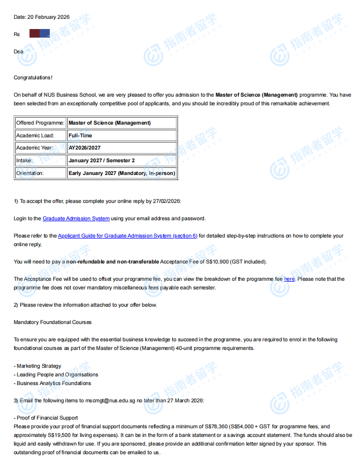 新加坡國立大學(xué)管理學(xué)理學(xué)碩士研究生offer一枚