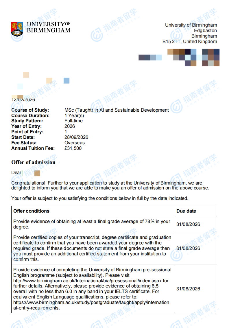 伯明翰大學(xué)人工智能與可持續(xù)發(fā)展理學(xué)碩士研究生offer一枚