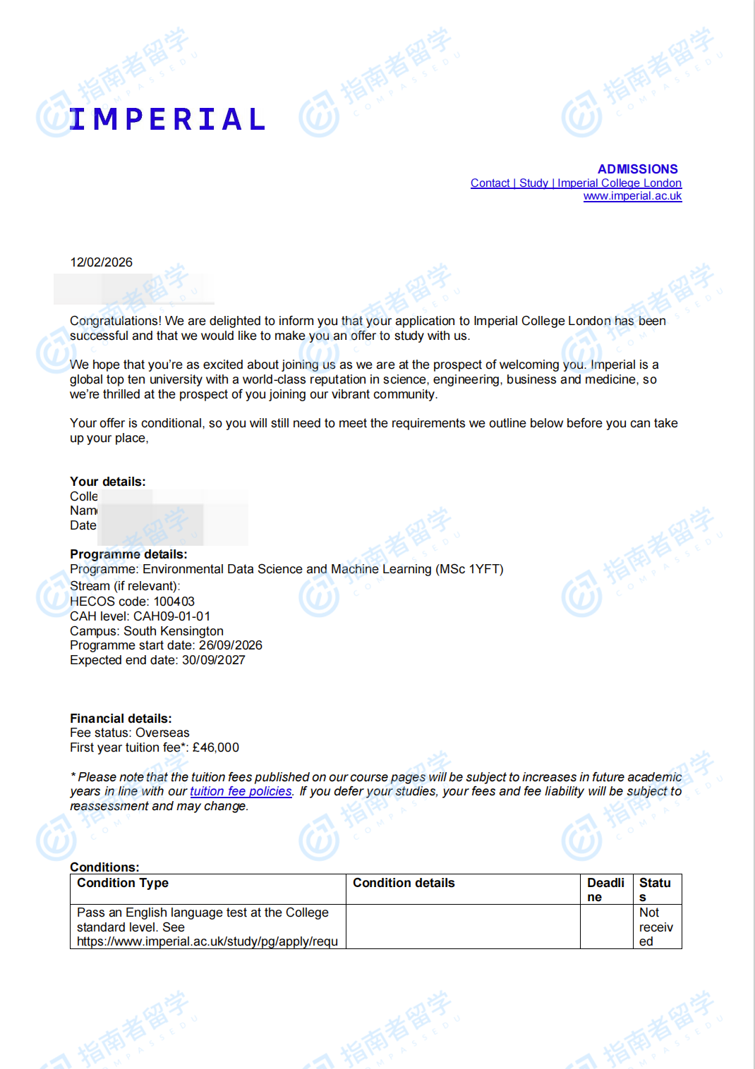 帝國理工學院環(huán)境數(shù)據(jù)科學與機器學習理學碩士研究生offer一枚
