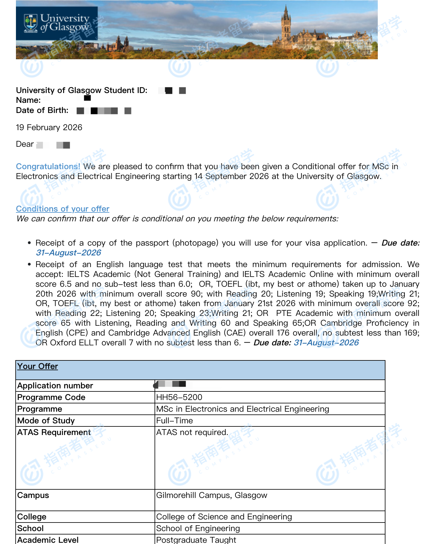 格拉斯哥大學(xué)電子與電氣工程理學(xué)碩士研究生offer一枚