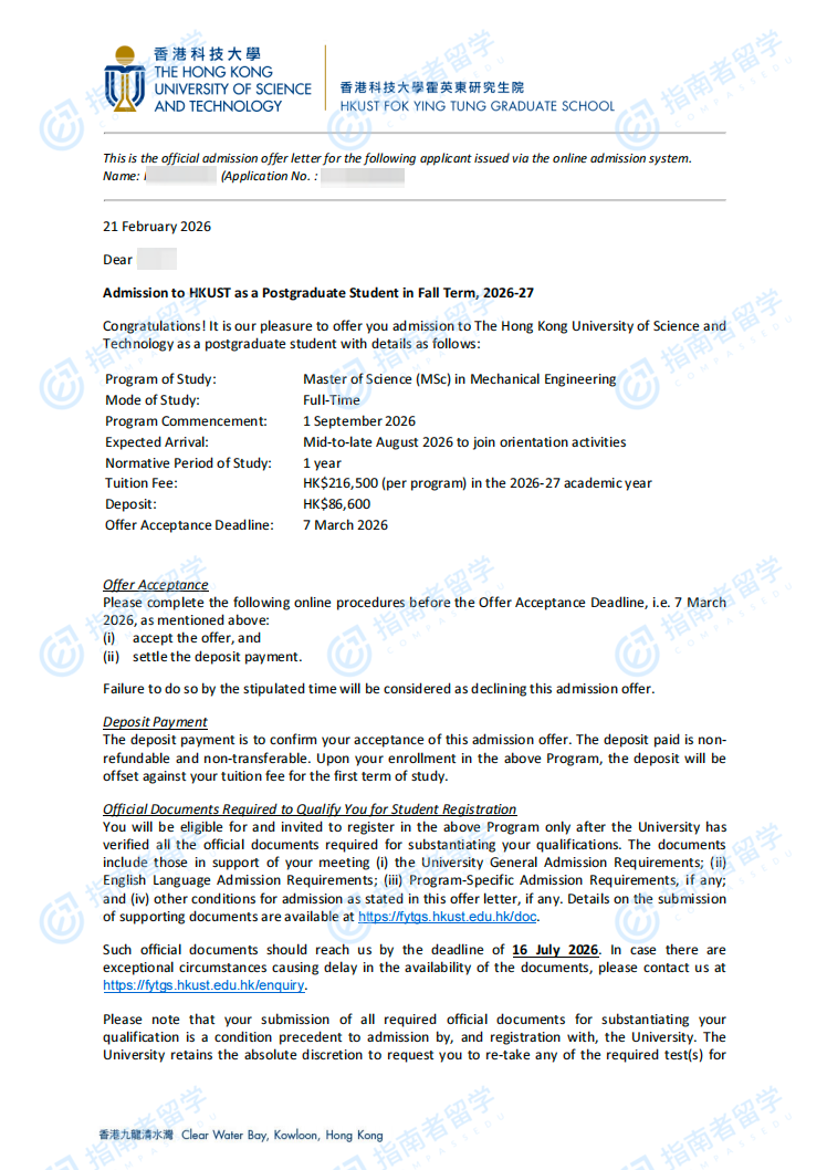香港科技大學(xué)機(jī)械工程理學(xué)碩士研究生offer一枚
